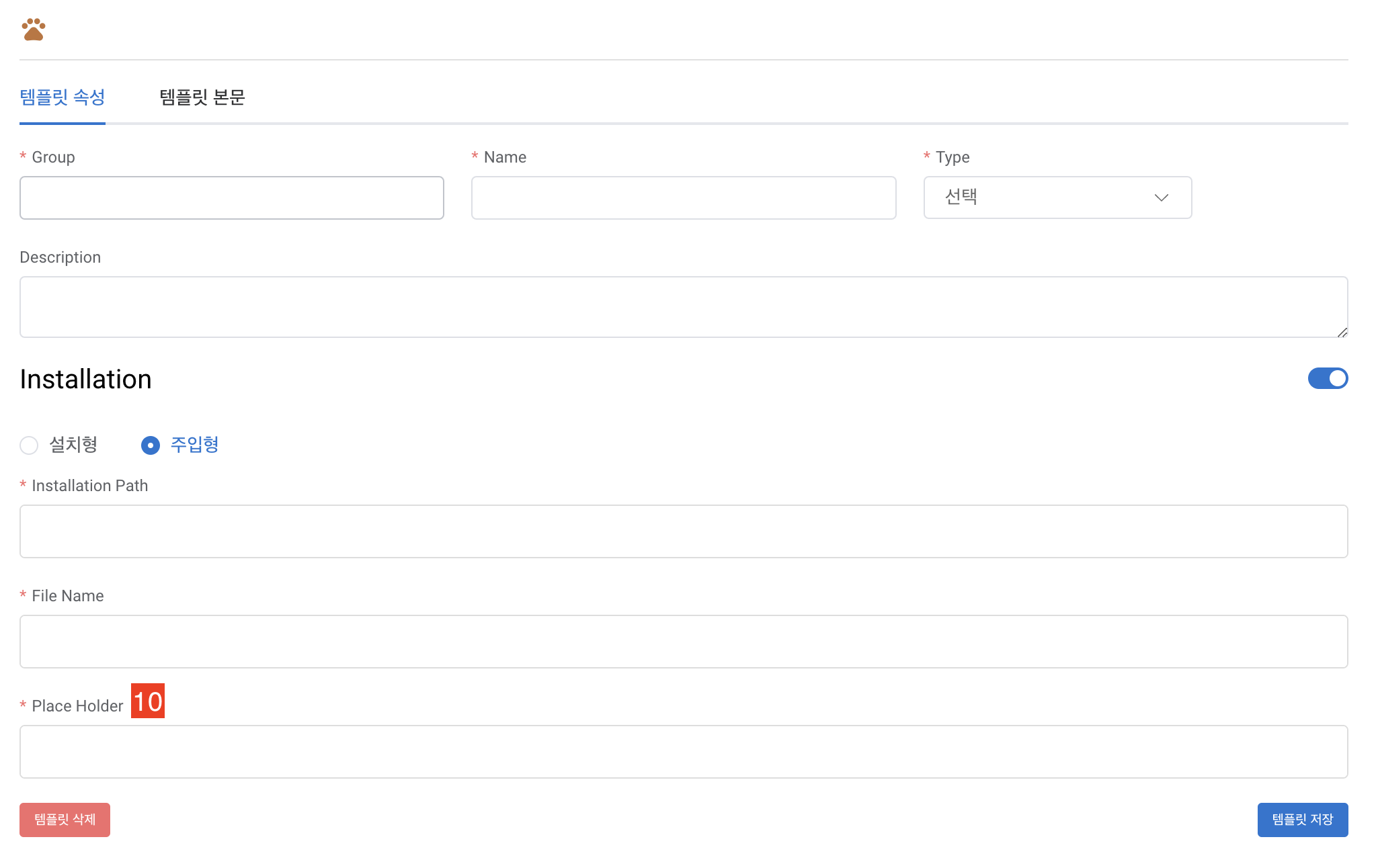 10. Place Holder | 주입형인 경우 노출 됩니다. 기존 파일 존재시, 기존 파일 내용에서 설정한 내용이 템플릿 내용으로 대체 됩니다. |